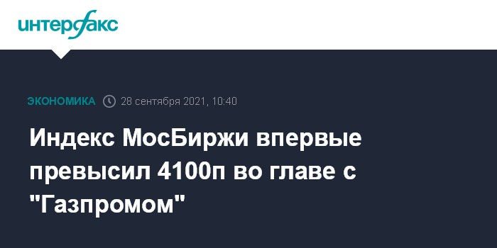 Москва. 28 сентября. INTERFAX.RU - Рынок акций РФ на старте торгов во вторник продолжил подъем вслед за стремительно дорожающей нефтью (Brent превысила $80 за баррель) и новыми рекордами цен на газ из-за ограниченного предложения в преддверии зимы; индексы РТС и МосБиржи за минуту торгов прибавили 0,6-0,7%, при этом индекс МосБиржи впервые превысил рубеж 4100 пунктов во главе с бумагами "Газпрома", подошедших к максимумам.