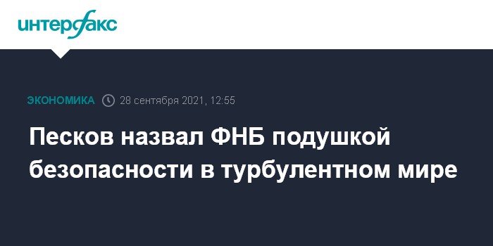 Москва. 28 сентября. INTERFAX.RU - Фонд национального благосостояния (ФНБ), несмотря на его пополнение на фоне высоких цен на газ в Европе, должен оставаться "как подушка безопасности", заявил пресс-секретарь президента РФ Дмитрий Песков.