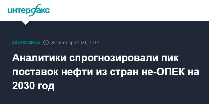 Москва. 28 сентября. INTERFAX.RU - Поставки нефти из стран, не входящих в ОПЕК, вернутся к допандемическому уровню в 65,5 млн б/с в 2022 году и будут расти до 70,4 млн б/с в 2026 году, пишут аналитики ОПЕК в своем ежегодном обзоре.