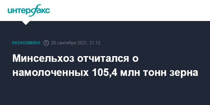 Москва. 28 сентября. INTERFAX.RU - Россия к 28 сентября убрала зерновые и зернобобовые культуры с 40,3 млн га, намолотив 105,4 млн тонн зерна (в бункерном весе), сообщил Минсельхоз. Урожайность, по расчетам, составляет 26,2 ц/га.