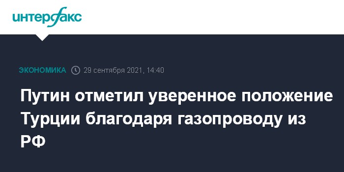 Москва. 29 сентября. INTERFAX.RU - На фоне турбулентных процессов на мировом газовом рынке Турция благодаря газопроводу из России "чувствует себя абсолютно уверенно и стабильно", заявил президент РФ Владимир Путин на встрече с турецким коллегой Реджепом Тайипом Эрдоганом.