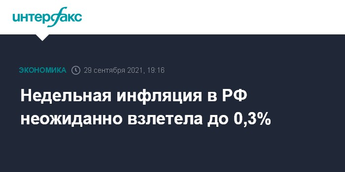 Москва. 29 сентября. INTERFAX.RU - Инфляция в РФ с 21 по 27 сентября резко ускорилась до 0,29% с 0,10% с 14 по 20 сентября, 0,04% с 7 по 13 сентября, 0,07% с 31 августа по 6 сентября, 0,09% с 24 по 30 августа, приводятся цифры в сообщении Росстата в среду.