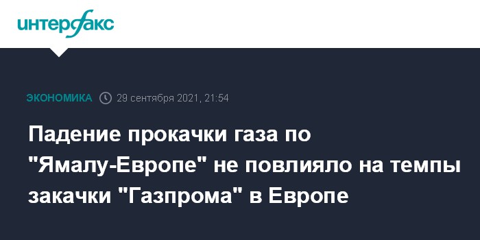 Москва. 29 сентября. INTERFAX.RU - Падение прокачки по газопроводу "Ямал-Европа" во вторник не сказалось на темпах закачки газа "Газпрома" в подземные хранилища в Европе, свидетельствуют данные ассоциации Gas Infrastructure Europe.