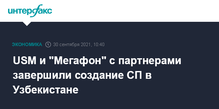 Москва. 30 сентября. INTERFAX.RU - ПАО "Мегафон", "ЮэСэМ Телеком" и партнеры из Узбекистана завершили создание совместного предприятия Digital Holding в Узбекистане, о формировании которого было объявлено в феврале.