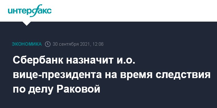 Москва. 30 сентября. INTERFAX.RU - Сбербанк назначит исполняющего обязанности вице-президента на время следствия по делу занимающей эту должность Марины Раковой.