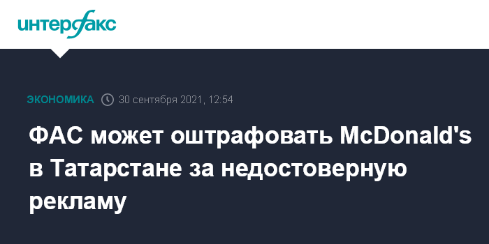 Москва. 30 сентября. INTERFAX.RU - Управление ФАС по республике Татарстан уличило McDonald's в недостоверной рекламе при открытии нового ресторана сети в Казани.