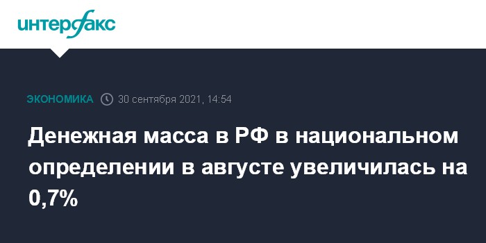 Москва. 30 сентября. INTERFAX.RU - Денежная масса (агрегат М2) в РФ в национальном определении в августе 2021 года увеличилась на 437,2 млрд рублей, или на 0,7%, до 59 трлн 816,9 млрд рублей, сообщается на сайте Банка России.