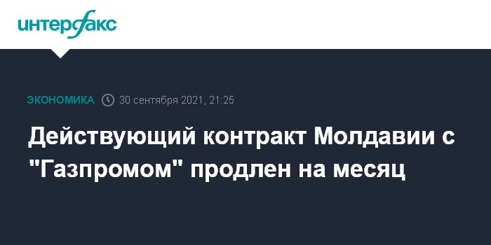 Москва. 30 сентября. INTERFAX.RU - Действующий контракт на поставку газа в Молдавию до завершения переговоров о новом контракте с "Газпромом" продлен на один месяц. Об этом сообщил вице-премьер Молдавии, министр инфраструктуры Андрей Спыну.