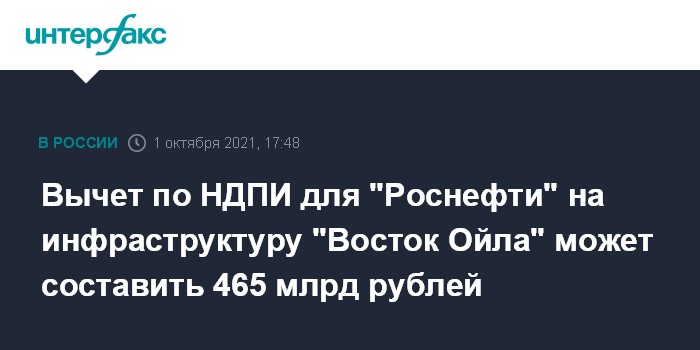 Вычет по НДПИ для "Роснефти" на инфраструктуру "Восток Ойла" может составить 465 млрд рублей