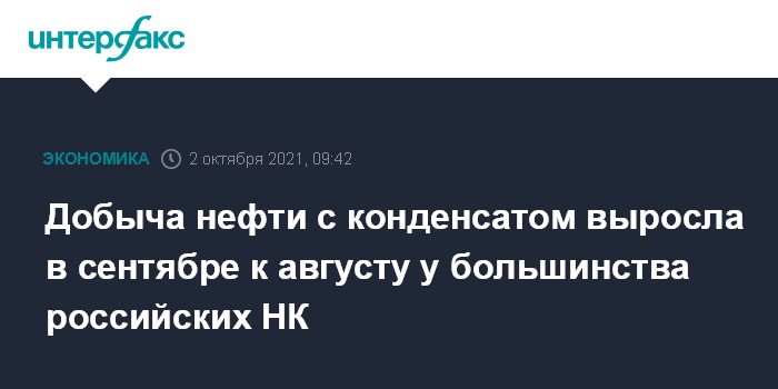 Относительно сентября 2020 года добыча нефти с газовым конденсатом поднялась в сентябре 2021 года почти у всех ведущих компаний. Самый значительный рост наблюдается у "Башнефти" (+83,4%) и "Славнефти" (+68,2%).