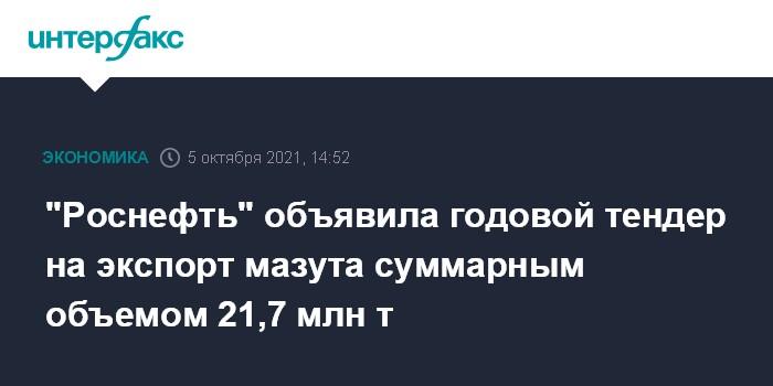 "Роснефть" объявила годовой тендер на экспорт мазута суммарным объемом 21,7 млн т