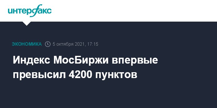 Москва. 5 октября. INTERFAX.RU - Индекс МосБиржи, один из основных российских фондовых индикаторов, вечером во вторник впервые превысил рубеж 4200 пунктов на фоне улучшения внешней фондовой конъюнктуры и раллирующих сырьевых рынков.