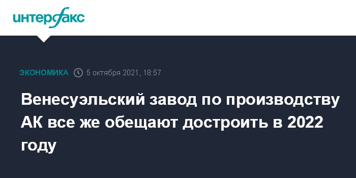 Москва. 5 октября. INTERFAX.RU - Власти Венесуэлы планируют завершить строительство завода по производству автоматов Калашникова во второй половине 2022 года будущего года, заявил в Москве посланник президента Венесуэлы Адан Чавес. Он выразил надежду, что на этот раз достроить предприятие ничто не помешает.