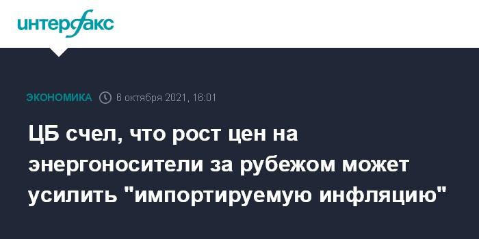 "Рост цен на энергоносители в Европе и в других странах действительно вызывает озабоченность с точки зрения роста инфляции в этих странах. Даже если это разовое явление, все равно тот масштаб, который происходит, скажется на стоимости товаров и услуг, производимых в этих странах, и в какой-то мере это может усилить то, что принято называть "импортируемая инфляция", для России", - сказал Заботкин на пресс-конференции в среду.