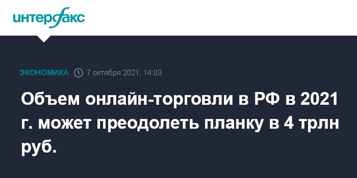 Москва. 7 октября. INTERFAX.RU - Объем онлайн-торговли в РФ по итогам 2021 года может превысить 4 трлн рублей, заявил глава Минпромторга России Денис Мантуров, выступая в рамках форума Ecomference Rupost Retail Week.