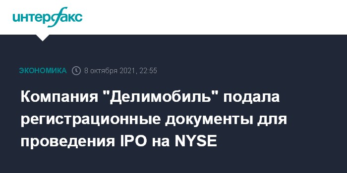 Москва. 8 октября. INTERFAX.RU -Холдинговая компания Delimobil Holding S.A., объединяющая каршеринговые проекты "Делимобиль", Anytime и Anytime.Prime, подала в Комиссию по ценным бумагам и биржам США регистрационные документы для проведения IPO на Нью-Йоркской фондовой бирже, говорится в ее сообщении.