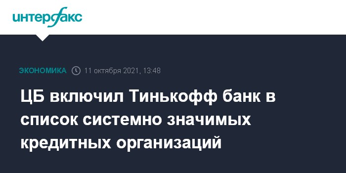ЦБ включил Тинькофф банк в список системно значимых кредитных организаций