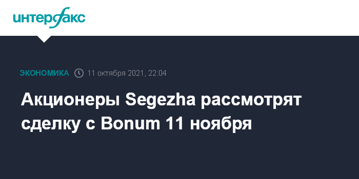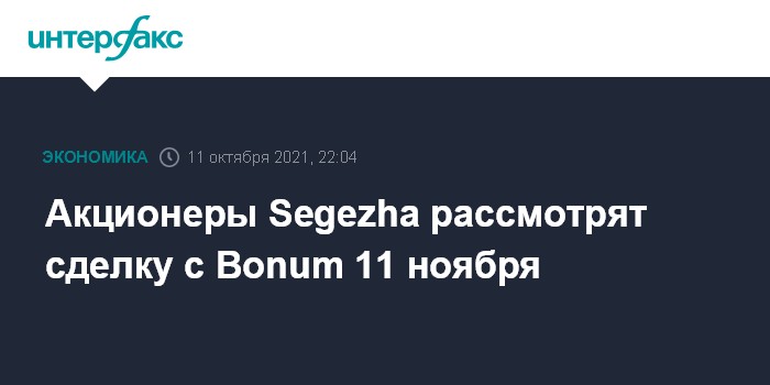 Москва. 11 октября. INTERFAX.RU - Подконтрольный АФК "Система" лесопромышленный холдинг Segezha Group 11 ноября созовет внеочередное собрание акционеров для одобрения сделки по покупке сибирских активов у инвесткомпании Bonum Capital Мурата Алиева.