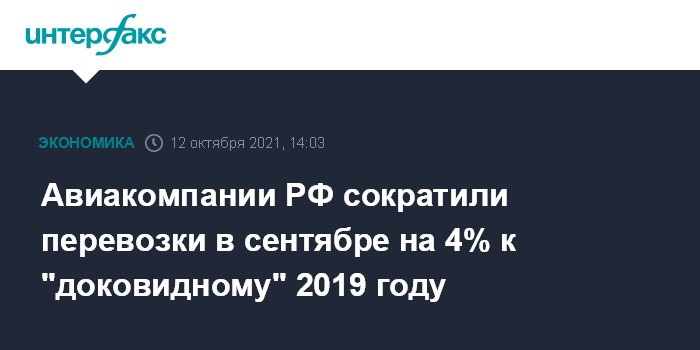 Москва. 12 октября. INTERFAX.RU - Пассажиропоток авиакомпаний РФ в сентябре 2021 года сократился в сравнении с сентябрем "доковидного" 2019 года на 4%, до 12,3 млн человек, следует из данных Минтранса РФ.