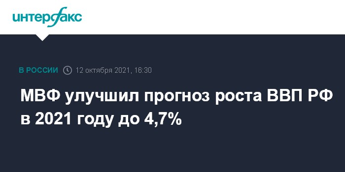 Москва. 12 октября. INTERFAX.RU - Международный валютный фонд (МВФ) улучшил оценку роста российской экономики в 2021 году до 4,7% с 4,4%, ожидавшихся им в июле, и 3,8%, прогнозировавшихся в апреле.