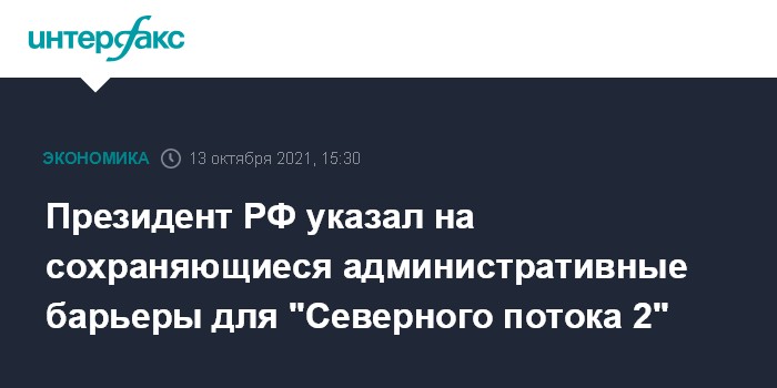 Москва. 13 октября. INTERFAX.RU - Административные барьеры, препятствующие скорейшему запуску "Северного потока 2", пока не преодолены, заявил президент России Владимир Путин на пленарном заседании "Российской энергетической недели".