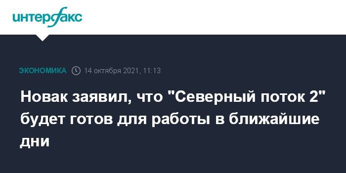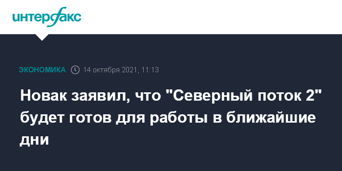 Москва. 14 октября. INTERFAX.RU - Газопровод "Северный поток 2" будет готов для работы в ближайшие дни, оператор магистрали ждет решения германских регуляторов, заявил вице-премьер РФ Александр Новак на форуме "Российская энергетическая неделя".