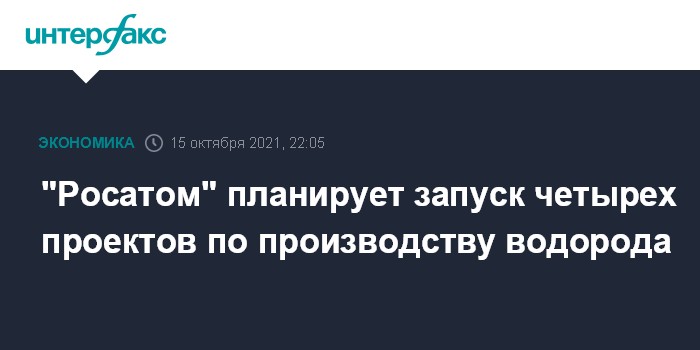 Москва. 15 октября. INTERFAX.RU - "Росатом" в 2024-2025 годах планирует запуск четырех пилотных проектов по производству водорода в России, следует из Атласа российских проектов по производству низкоуглеродного и безуглеродного водорода и аммиака, представленного Минпромторгом.