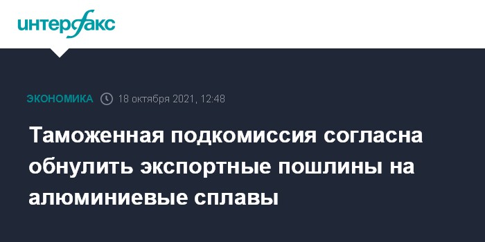 Москва. 18 октября. INTERFAX.RU - Подкомиссия по таможенно-тарифному и нетарифному регулированию поддержала обнуление ставок вывозных таможенных пошлин на алюминиевые сплавы, сообщила пресс-служба Минэкономразвития.