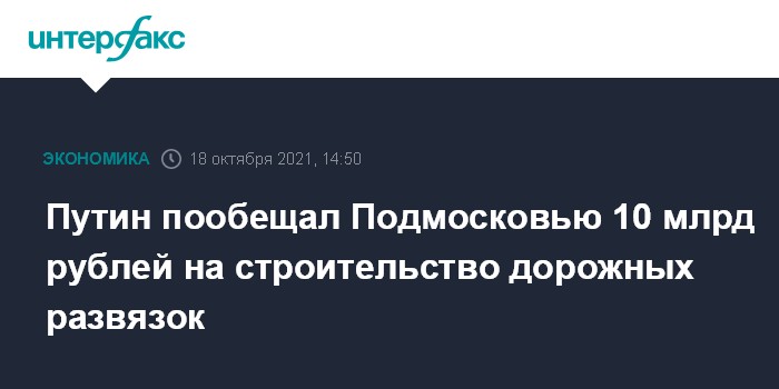 Москва. 18 октября. INTERFAX.RU - Правительство выделит Подмосковью дополнительно 10 млрд рублей на строительство новых дорожных развязок, сообщил губернатору Московской области Андрею Воробьеву президент Владимир Путин.