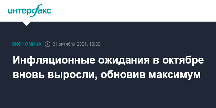 Москва. 21 октября. INTERFAX.RU - Инфляционные ожидания населения в октябре вновь выросли, обновив максимальные значения в 2021 году, зафиксированные в июле.