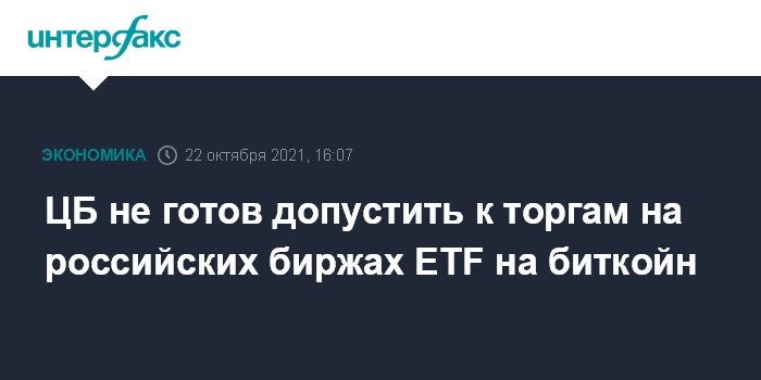 Москва. 22 октября. INTERFAX.RU - Центральный банк не готов допустить на российские биржи ETF, где базисным активом будет биткойн, сказала в пятницу в ходе пресс-конференции глава регулятора Эльвира Набиуллина.