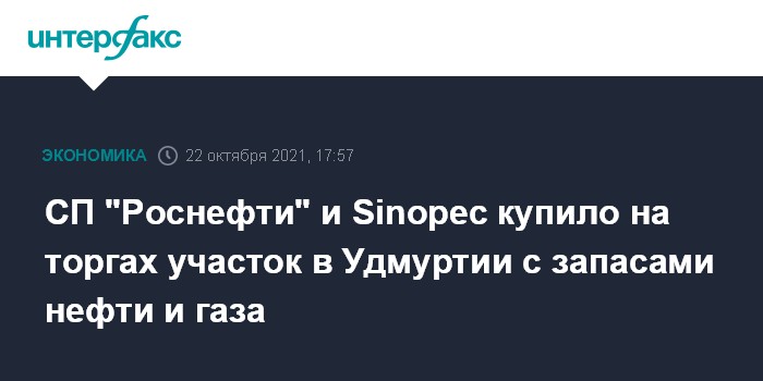 СП "Роснефти" и Sinopec купило на торгах участок в Удмуртии с запасами нефти и газа