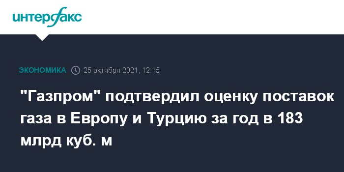 Москва. 25 октября. INTERFAX.RU - "Газпром" подтвердил оценку поставок газа в Европу и Турцию в 2021 году в 183 млрд куб. м, заявила в интервью журналу "Газпром" заместитель председателя правления ПАО "Газпром", генеральный директор ООО "Газпром экспорт" Елена Бурмистрова.