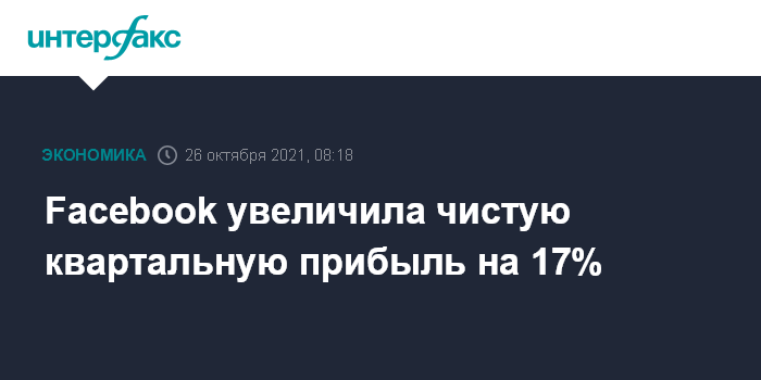 Москва. 26 октября. INTERFAX.RU - Компания Facebook Inc., которой принадлежит крупнейшая в мире социальная сеть, увеличила чистую прибыль в третьем квартале 2021 года на 17%, до $9,19 млрд с $7,85 млрд годом ранее. Прибыль в расчете на акцию выросла до $3,22 с $2,71 при прогнозе аналитиков, опрошенных FactSet, на уровне $3,22.