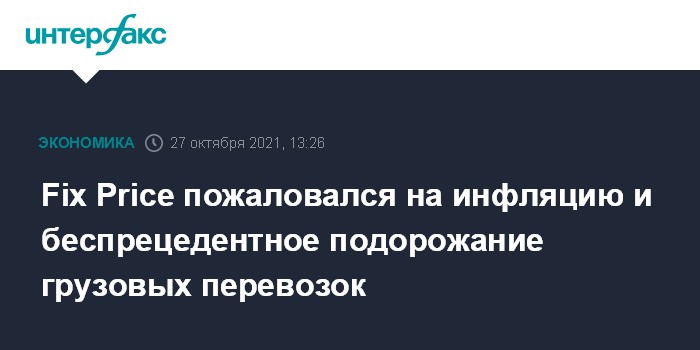 Москва. 27 октября. INTERFAX.RU - Ритейлер Fix Price, управляющий крупнейший в России сетью магазинов фиксированных цен, назвал высокую инфляцию и беспрецедентный рост стоимости грузовых перевозок в числе ключевых факторов, оказывающих давление на ритейл.