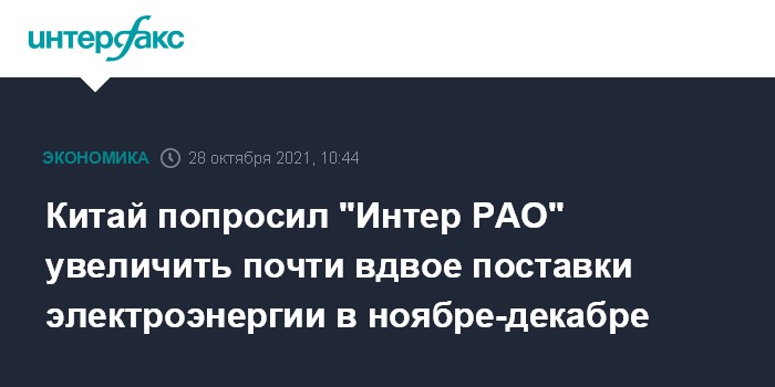 "Интер РАО" с 1 октября увеличила в два раза экспорт электроэнергии в Китай по сравнению с плановыми объемами на 2021 и уровнем поставок в октябре 2020 г. Причиной энергодефицита в северных провинциях КНР стала, в том числе, нехватка угля для местных ТЭС.
