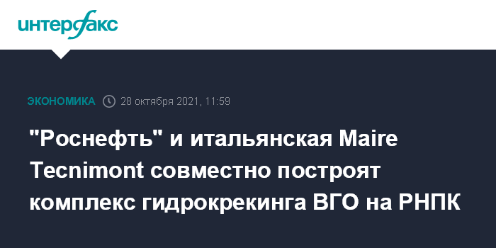 Москва. 28 октября. INTERFAX.RU - "Роснефть" и итальянская Maire Tecnimont в рамках ХIV Евразийского экономического форума в Вероне подписали соглашение о намерениях по реализации инвестиционного проекта "Строительство комплекса Гидрокрекинга вакуумного газойля (ВГО)" на производственной площадке Рязанской НПК, сообщила "Роснефть.