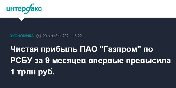 Чистая прибыль ПАО "Газпром" по РСБУ за 9 месяцев впервые превысила 1 трлн руб.