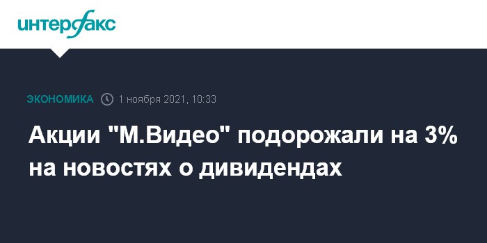 Москва. 1 ноября. INTERFAX.RU - Акции ритейлера "М.Видео" утром в понедельник подорожали на 3% на новости о рекомендациях совета директоров по размеру дивидендов за девять месяцев 2021 года.