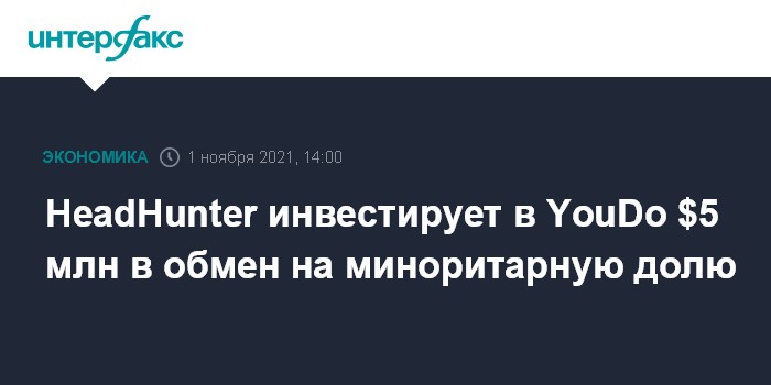 В сообщении рекрутингового сервиса говорится, что по итогам сделки HH станет миноритарным владельцем YouDo (точная доля не раскрывается).