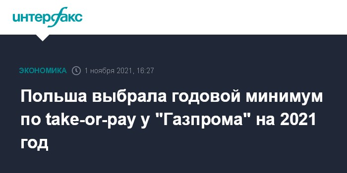 Москва. 1 ноября. INTERFAX.RU - Польша за 10 месяцев 2021 года импортировала из России 8,8 млрд куб. м газа, полностью выбрав годовой минимум по условию "бери или плати" (take-or-pay), следует из данных "Газпрома" и Федеральной таможенной службы.