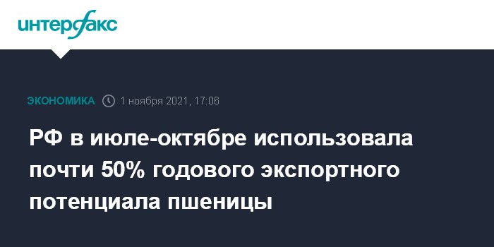 Москва. 1 ноября. INTERFAX.RU - Россия за четыре месяца текущего сельхозгода (июль-октябрь 2021 года) использовала почти половину годового экспортного потенциала пшеницы, следует из мониторинга Российского зернового союза.