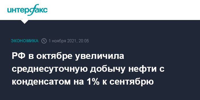 Согласно условиям соглашения ОПЕК+, Россия в октябре могла добывать 9,8 млн баррелей в сутки. В сентябре Россия вышла на среднесуточный уровень производства конденсата (не учитывается в сделке ОПЕК+) свыше 105 тыс. т. Таким образом, если уровень производства конденсата в октябре остался на уровне сентября (статистика запаздывает на месяц), то добыча только нефти могла составить 1374 тыс. т/сут., или 9,9 млн б/с со средним коэффициентом баррелизации 7,22, что означает исполнение сделки на 90%.