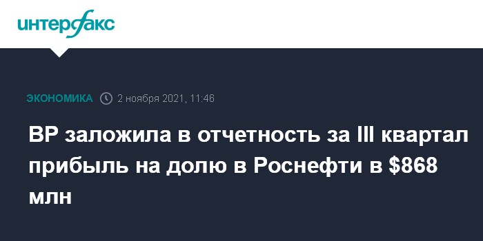 Москва. 2 ноября. INTERFAX.RU - Британская BP plc оценила прибыль до вычета налогов и процентов от участия в "Роснефти" в качестве акционера в III квартале 2021 года в $868 млн по сравнению с прибылью в $643 млн во втором квартале текущего года и убытком в $278 млн годом ранее, следует из отчетности компании.