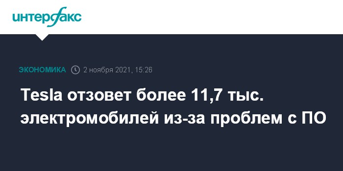 Москва. 2 ноября. INTERFAX.RU - Американская Tesla Inc отзовет около 11,7 тысячи электромобилей Model S, Model 3 и Model X выпуска 2017-2021 года, а также Model Y 2020-2021 выпуска года в связи с ошибкой в работе программного обеспечения.