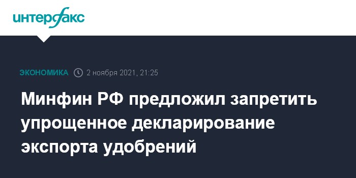 Москва. 2 ноября. INTERFAX.RU - Минфин РФ предлагает запретить применение упрощенных процедур декларирования при экспорте азотных и сложных удобрений.