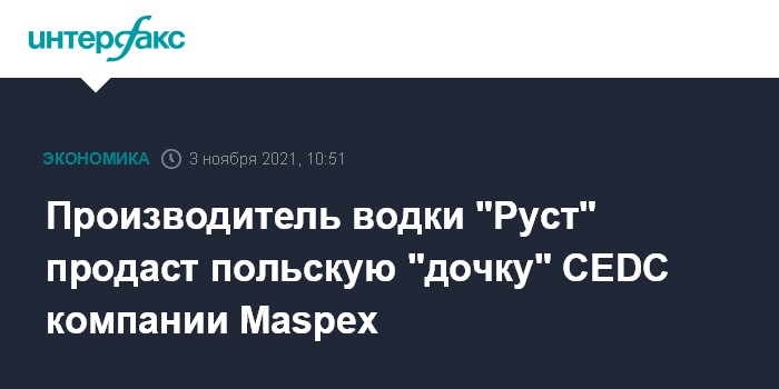 Москва. 3 ноября. INTERFAX.RU - Группа компаний "Руст", второй крупнейший производитель водки в мире, сообщила, что подписала соглашение о продаже своей польской дочерней компании CEDC International Sp. z o.o. (CEDC) группе компаний Maspex, крупнейшей в Польше и одной из ведущих в Центральной и Восточной Европе компаний в сегменте продуктов питания.