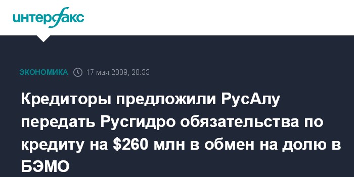 Москва. 17 мая. ИНТЕРФАКС - Кредиторы предложили ОК "РусАл" передать свои обязательства в размере $260 млн ОАО "РусГидро" в обмен на доли (по 50% акций) в объектах строительства БЭМО (Богучанское энерго-металлургическое объединение) - Богучанском алюминиевом заводе и Богучанской ГЭС.