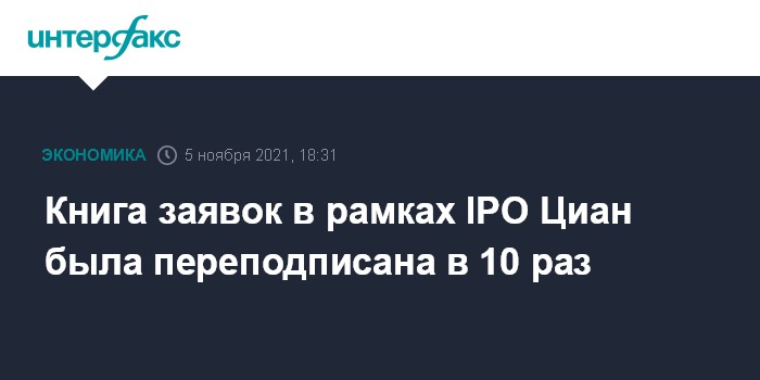 Москва. 5 ноября. INTERFAX.RU - Книга заявок в рамках IPO Cian plc, холдинговой компании сервиса "Циан", была переподписана в 10 раз, сообщил "Интерфаксу" источник, знакомый с итогами размещения.
