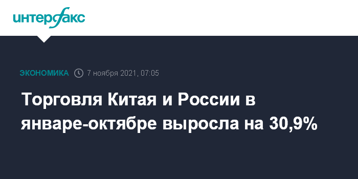 Россия импортировала из Китая товаров на сумму $52 млрд, рост по сравнению тем же периодом 2020 года составил 30,6%. Китайский импорт из РФ достиг $62,75 млрд, рост - 31,2%.